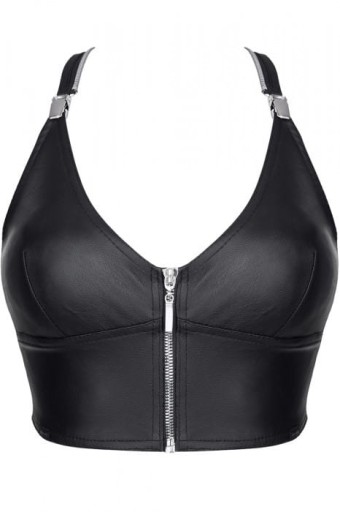 Krótki top z profilowanymi miseczkami. Z przodu zwraca uwagę atrakcyjny dekolt oraz srebrny ozdobny ekspres. Szelki będące w zestawie są odpinane. Wyróżnia je oryginalny pomysł i wygląd. Są zrobione z ozdobnych zapinek oraz ekspresu, który także jest ozdobny oraz służy do regulacji długości szelek.Top w całości został wykonany z czarnej, elastycznej ekoskóry z fakturą prawdziwej skóry. Jest miły w dotyku i wspaniale dopasowuje się do ciała.Doskonale pasuje m.in. do spodni BRMaddalena001 - widocznych na zdjęciach.Kolor: czarnyRozmiary: S,M,L,XL,XXLSkład surowcowy: 95% poliester / 5% elastan