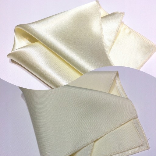 Poszetka po jednej stronie jest matowa, a po drugiej błyszcząca. Brzegi poszetki zostały starannie obszyte. Można ją złożyć w dowolny sposób.