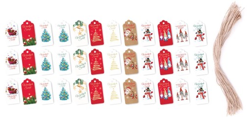 W zestawie jest 36 szt. zawieszek (3x12 wzorów) oraz 36 szt. sznureczków jutowych.