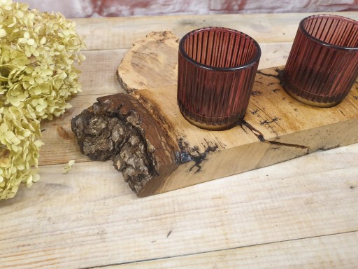 Ręcznie wykonany świecznik na tealighty z drewna orzechowego. Drewno jest wypalane prądem, który tworzy wyjątkowe wzory, następnie lakierowane. Drewniana podstawka posiada wydrążenia na trzy szklane świeczniki na tealighty.