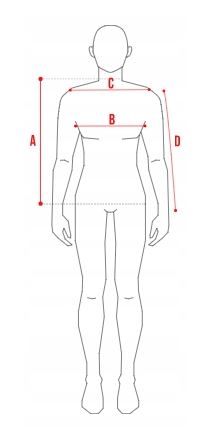 A - dł.całkowita B - obw. w klatce C - szer.ramion D - dł.rękawa