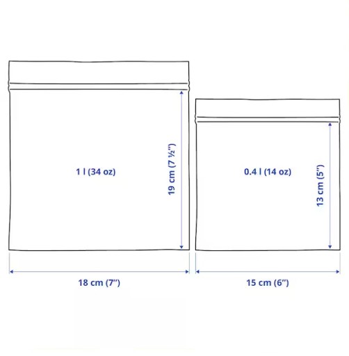 - Zawartość zestawu: 30 torebek (0.4 l, 15x15.5 cm) i 30 torebek (1 l, 18.21.5 cm).