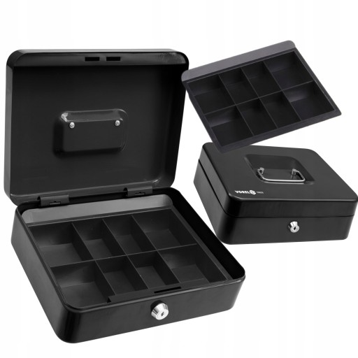Przenośna kaseta na pieniądze o wymiarze 250x200x90mm. Wykonana z blachy stalowej o grubości 0,7mm, pomalowana w kolorze czarnym. Zamykana na zamek. W zestawie znajdują sie 2 klucze. Wewnątrz wyciągana wkładka na monety wykonana z tworzywa sztucznego.