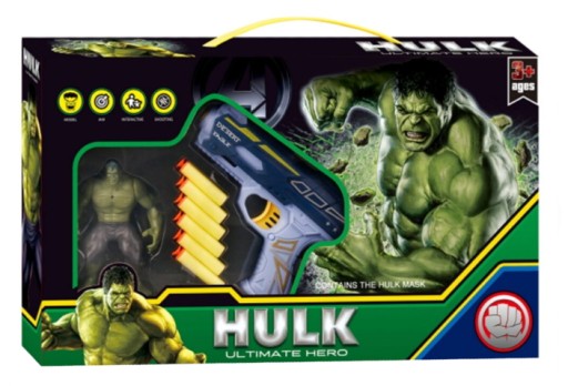 Pistolet wyposażony w bezpieczne piankowe strzałki dzięki, którym możesz strzelać w figurkę HULK - w zestawie również maska.