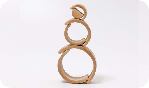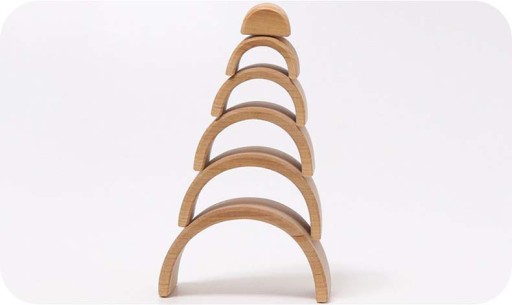 Drewniane łuki Grimm's w naturalnym kolorze drewna kryją w sobie znacznie więcej możliwości niż mogłoby wydawać się na pierwszy rzut oka. Dziecko może ustawiać je na wiele sposobów. Przy odrobinie cierpliwości i koncentracji da się z nich wyczarować fantazyjne wieże, konstrukcje wyglądające jak nowoczesne rzeźby a także tak zwyczajne rzeczy jak tunel dla aut, mostki czy ogrodzenie. Łuki mogą stać się także kołyską lub huśtawką dla laleczek Grimm's. Tak naprawdę to co powstanie z łuków Grimm's zależy wyłącznie od kreatywności dziecka.