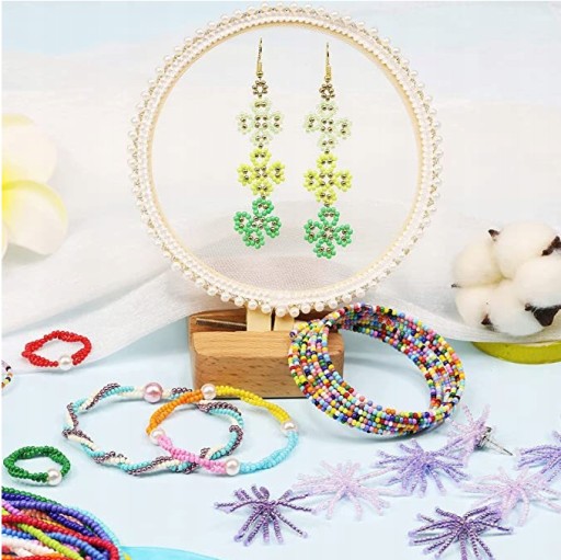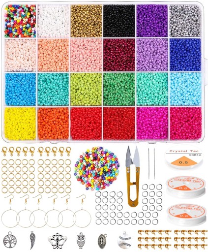 W zestawie znajdziemy koraliki drobne w ponad 24 kolorach seeds 2mm, gumka silikonowa na szpulce, nożyczki, igły do nawlekania, ogniwa, zapięcia, kolczyki oraz metalowe zawieszki ozdobne.