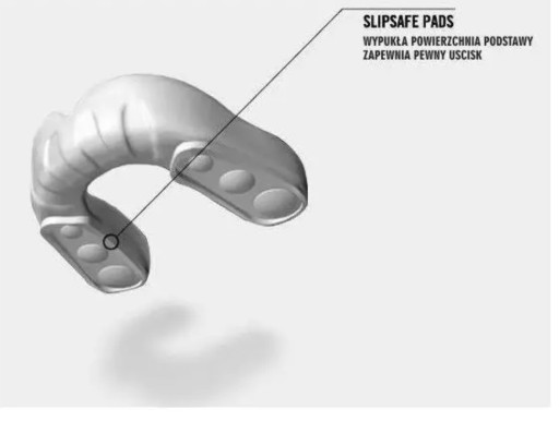 Wypukła powierzchnia podstawy ochraniacza zapewnia bezpieczny uścisk dla użytkownika. Kształt szczęki dodatkowo zapewnia swobodny przepływ powietrza ułatwiając przy tym oddychanie.