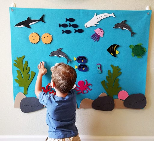 Filcowe akwarium z dekoracjami na rzepy (42 elementy do dowolnego ozdobienia). Wymiary to ok. 100 x 80cm. Filcowa ozdoba ścienna nawiązuje do podwodnego świata zwierząt i roślin oraz jest świetnym pomysłem na prezent dla malucha - rozwija kreatywność i zdolności manualne dziecka :)
