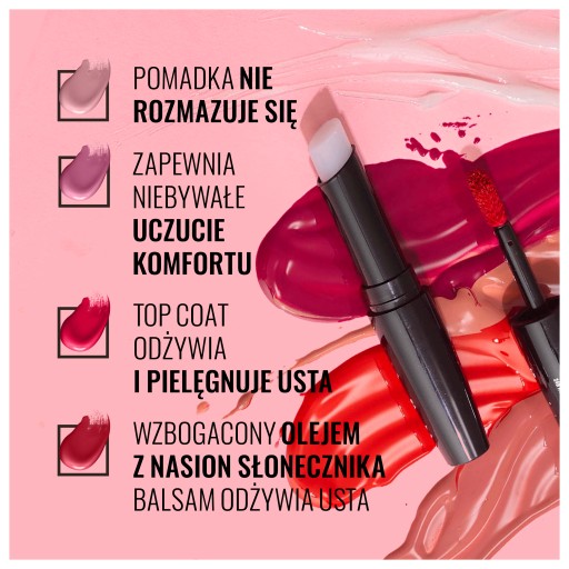 - Odporna na ścieranie formuła oraz kolor, połysk i nawilżenie, którymi możesz cieszyć się aż do 16 godzin.