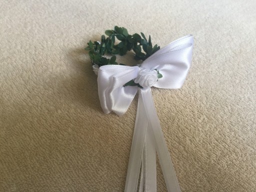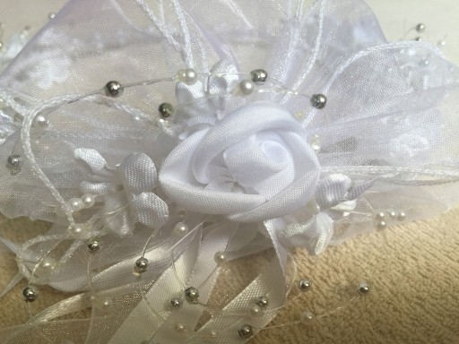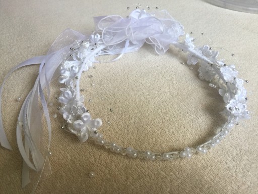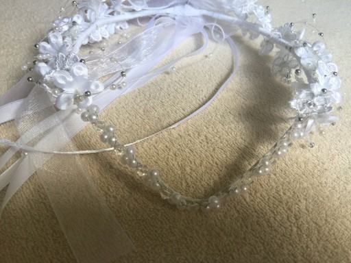 - Biały wianek komunijny ozdobiony delikatnymi kwiatkami z perełkami. Można go kształtować.