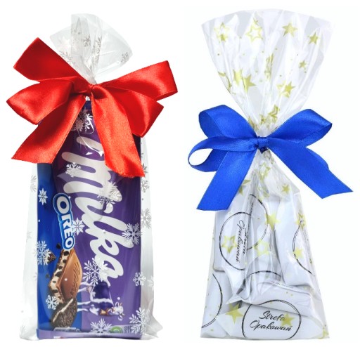 Poniżej upominki świąteczne zapakowane w przykładowe wzory torebek w rozmiarze 10x25 cm: