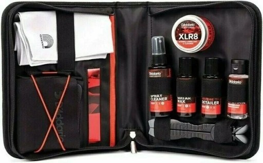 Zawiera między innymi: XLR8, 3 stopniowy zestaw do polerki, nawilżacz oraz czyścik do podstrunnicy, podkładkę pod główkę gitary i inne