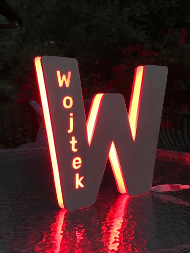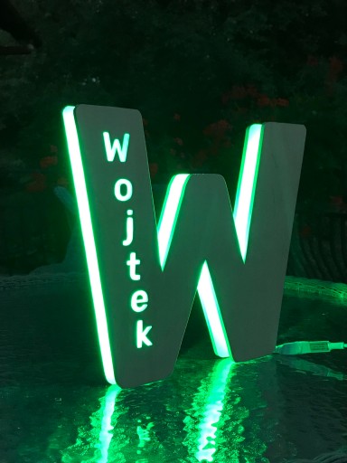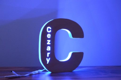 Lampka dekoracyjna w kształcie wybranej litery i wpisanym w literę dowolnym imieniem/napisem.