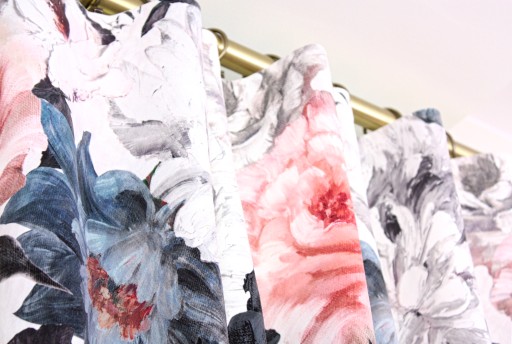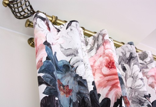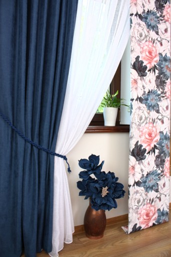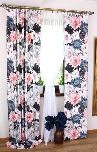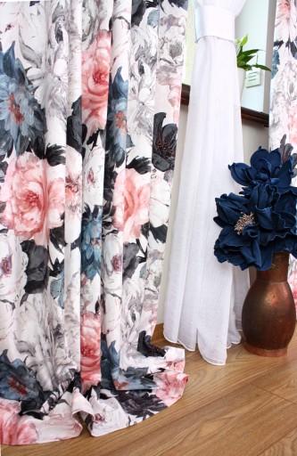Przedmiotem sprzedaży zasłona z Velvetu zdobiona drukowanym wzorem ( lewa strona tkaniny jest biała bez wzoru) . Przepiękne zestawienie, duże kwiaty w kolorze delikatnego różu zostały połączone z niebieskim oraz oraz prawie czarnym kwiatem ostatecznie stwarzając niesamowity efekt wizualny .