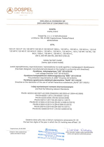 DEKLARACJA ZGODNOŚCI WENTYLATORA Dospel Styl 120 S Standard 007-0003 P