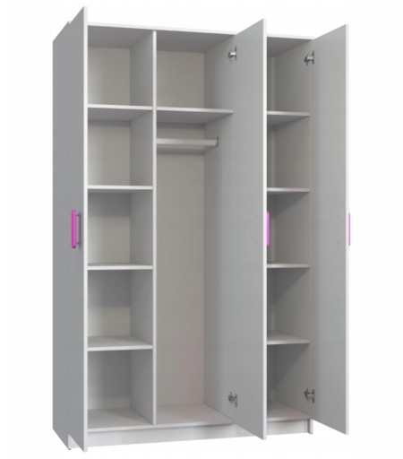 Funkcjonalna, pojemna, trzydrzwiowa. Mebel konieczny w każdy pokoju dziecięcym. Miejsce do przechowywania ubrań jak i zabawek. Za trzema uchylnymi drzwiczkami znajdziemy przestrzeń podzieloną na trzy części. Łącznie do dyspozycji mamy 9 półek oraz jedną wysoką przestań z drążkiem do wieszania ubrań.