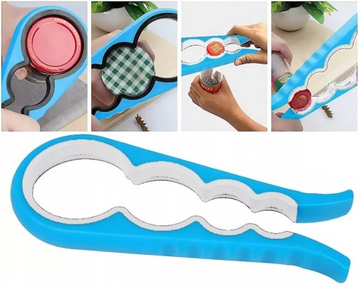 Uniwersalny otwieracz do słoików oraz butelek. Otwieracz posiada 4 otwory o różnych rozmiarach, dzięki którym otworzysz praktycznie każdą butelkę oraz słoik bez potrzeby używania siły.