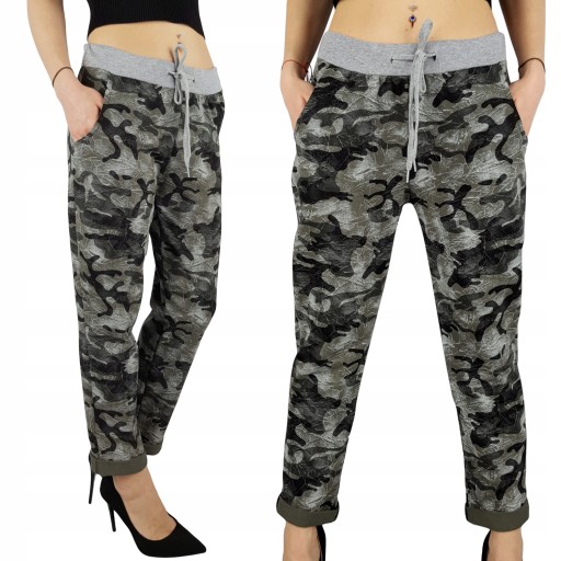 Materiał jest elastyczny i poddaje się kilka cm dopasowując się do sylwetki. Spodnie naciągają się w pasie około 8 - 10cm. biodra około 10 cm.
