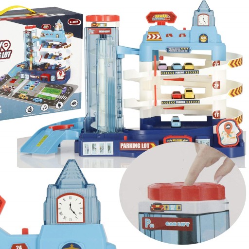 - 1 x część główna parkingu, posiada 3 kondygnacje oraz spiralną windę unoszącą pojazdy na najwyższą kondygnację. Winda bezpieczna dla dzieci, osłonięta przezroczystym tworzywem akrylowym, umożliwia śledzenie przejazdu pojazdu. Możliwość podnoszenia windy również ręcznie za pomocą znajdującego się na górze pokrętła. (zasilanie 2 x bateria AA) - niezależny włącznik