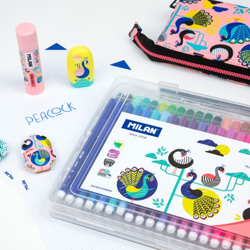 50-kolorowy zestaw flamastrów w twardej, plastikowej walizce z kolekcji PEACOCK. Flamastry posiadają stożkową końcówkę o średnicy 5 mm, która nie wpada do środka nawet przy silnym nacisku. Po chwilowym odkształceniu końcówka zawsze wraca do pierwotnego kształtu. Pozwala na rysowanie cienkich i grubych linii od 0,75 mm do 3 mm. Tusz na bazie wody tworzy jaskrawe i intensywne kolory, które można ze sobą mieszać. Tusz można łatwo wyprać z większości tkanin (moczyć tkaninę w zimnej wodzie przez godzinę, a następnie prać w pralce w niskiej temperaturze). Bezpieczna wentylowana skuwka umożliwia oddychanie w przypadku połknięcia. Flamastry MILAN są zgodne z europejskimi i amerykańskimi normami bezpieczeństwa. Nie zawierają ftalanów, metali ciężkich i innych substancji toksycznych. Są bezpieczne dla dzieci. Rozmiar flamastra: 16,5 x ? 1,04 cm. Rozmiar opakowania: 31 x 22,5 x 3 cm.