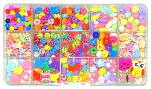 - Koraliki o różnych kształtach i kolorach,