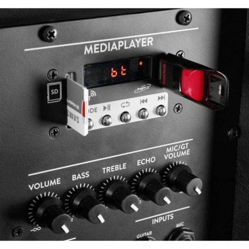 Dostarczanie dużej głośności z wbudowanego wzmacniacza mocy szczytowej 350W oraz zintegrowanego odtwarzacza multimedialnego pozwala odtwarzać muzykę z głośnika bez potrzeby korzystania z odtwarzacza CD/ odtwarzacza multimedialnego lub miksera. Odtwarzacz multimedialny obsługuje formaty plików MP3 z USB i kart SD, a także zawiera Bluetooth do bezprzewodowego przesyłania strumieniowego dźwięku z Twojego ulubionego urządzenia.
