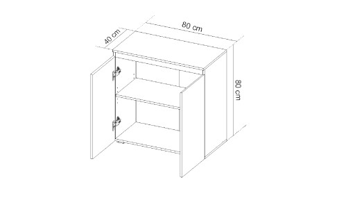 Komoda o solidnej konstrukcji, idealna do przechowywania rzeczy w salonie, pokoju dziecięcym młodzieżowym lub sypialni, wyposażona w dwoje drzwi i jedną półkę. Bardzo ustawna i uniwersalna. Pasuje do większości projektów wnętrz.