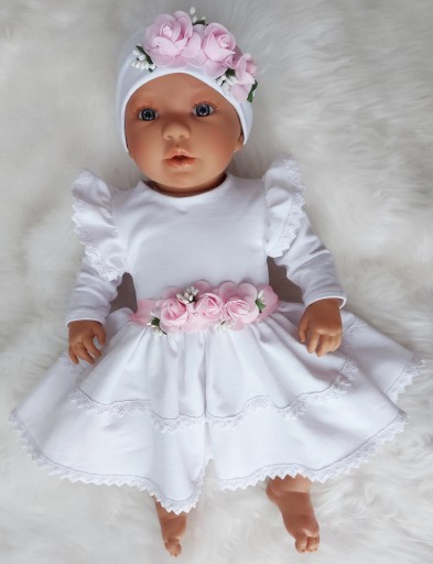 Sukieneczka wykonana z białej dzianiny bawełnianej (95% bawełna 5 % elastan), wykończona piękną koronką bawełnianą, zapinana z tyłu na zatrzaski, zawiązywana szarfą ozdobioną różyczkami