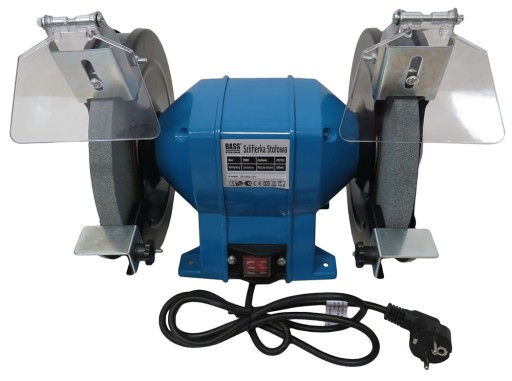 Szlifierka stołowa dwu-kamienna marki BASS POLSKA o kompaktowej obudowie, z zapewniającymi bezpieczeństwo podczas pracy osłonami.