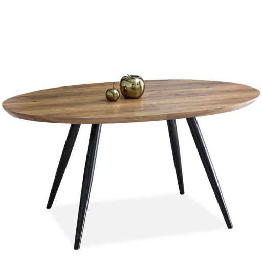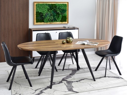 Prezentowany egzemplarz z kolekcji LIBON z pewnością przypadnie do gustu szerokiej grupie odbiorców. Dlaczego? Jest elegancki, a zarazem niezwykle praktyczny. Został wykonany z fornirowanej płyty MDF o barwie postarzanego orzecha. Podstawę tworzą zaś nogi ze stali pomalowanej na czarno. Wspomniany duet kolorystyczny świetnie sprawdza się we wnętrzach nowoczesnych, industrialnych, a także eklektycznych. Opisywany stół LIBON posiada dodatkowy blat. Można go rozłożyć, korzystając z niewielkiej rączki przymocowanej do konstrukcji. Cały proces nie zajmuje wiele czasu i nie wymaga użycia dużej siły.