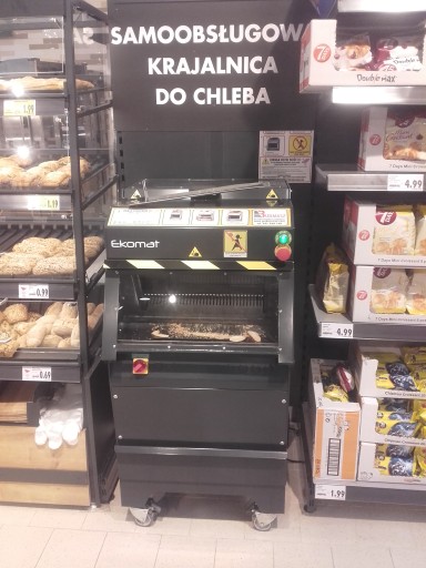 Krajalnica samobsługowa EKOMAT PLUS to najlepszy wybór dla supermarketów. Doskonała samodzielna krajalnica, pozwala użytkownikom kroić chleb z całkowitym bezpieczeństwem. Idealna do sklepów samoobsługowych, gdzie klient samodzielnie kroi zakupione pieczywo, a także może być obsługiwana przez ekspedientki w sklepie. Krajalnica wyposażona jest w kółka, co umożliwia łatwe jej przemieszczanie. Kompaktowe wymiary (zajmuje miejsce podłogi o wymiarach 63×68 cm) pozwalają na postawienie tego urządzenia w sklepie i wkomponowaniu go np. między lady wystawowe lub regały z pieczywem. Krajalnica Ekomat Plus jest tak skonstruowana, aby jego obsługa (podanie i odbiór chleba) była z jednej strony – od frontu. Krajalnica uruchamiana jest przez podniesienie i opuszczenie górnej osłony . Jest to idealny wybór dla użytkowników mających niewiele miejsca w sklepie .