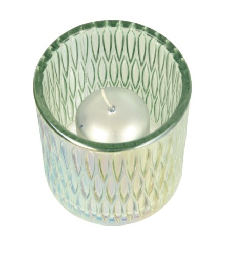 Efektowny świecznik szklany blado zielony z delikatnym tęczowym, mieniącym się połyskiem.