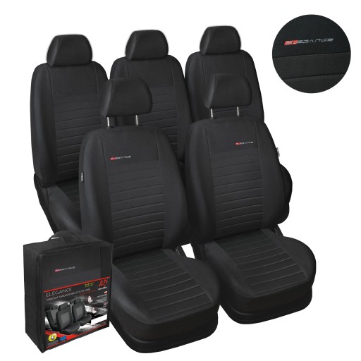 - RZĄD I (2 fotele)- jednoczęściowe z łatą montażową wciąganą w szczelinę między siedzisko a oparcie, przystosowane do poduszek powietrznych, na plecach możliwość użycia stolików, poniżej zagłówka wyhaftowany napis "ELEGANCE", 2 pokrowce na zagłówki i 2 na podłokietniki.