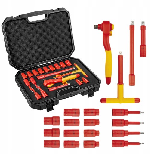 Zestaw kluczy nasadowych 1/2" NEO (nr ref. 01-306) składa się z 19 elementów, wykonanych z wysokiej jakości stali chromowo-wanadowej. W skład zestawu wchodzi odgięta grzechotka, wyposażona w trwały mechanizm zapadkowy (36 zęby) i ergonomiczny uchwyt. Zestaw zawiera bogaty pakiet nasadek sześciokątnych (w rozmiarach od 10 do 21 mm). Uzupełnieniem zestawu są przedłużki, przegub, pokrętło i klucze sześciokątne na nasadkach (w rozmiarach4 do 8 mm). Całość jest dostarczona w praktycznej i solidnej walizce wykonanej z tworzywa.