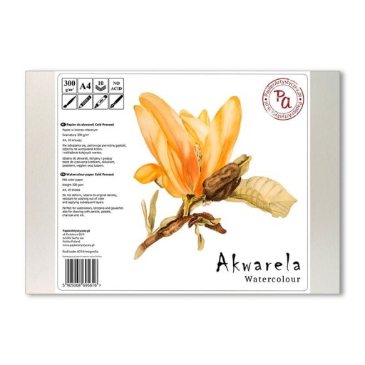 Papier akwarelowy Cold Pressed Magnolia zawiera 10 arkuszy wysokiej jakości papieru o gramaturze 300g/m2 w kolorze mlecznym, w formacie A4. Jest doskonały do wszystkich technik wodnych takich jak: akwarela, tempera i gwasz. Po wyschnięciu papier nie odkształca się i zachowuje swoją pierwotną gęstość. Jest odporny na wymywanie koloru i nakładanie kolejnych warstw. Polecany profesjonalistom oraz początkującym malarzom.