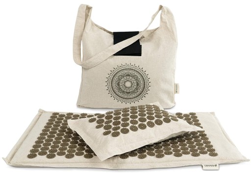 Otrzymasz matę (221 igieł, 71 x 43 x 3 cm) oraz poduszkę do akupresury (51 igieł, 41 x 29 x 8 cm) z lnu, włókien kokosowych i łupin gryki. Zestaw do akupresury jest dostarczany w torbie do przechowywania.