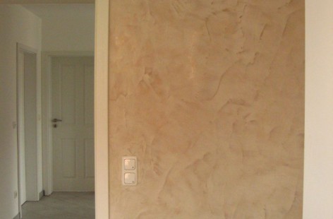 Krok 3 - nakładanie warstwy 1 - Stiuk należy nakładać pacą wenecką ze stali nierdzewnej. Jeśli podłoże nie jest jednolite tzn. nie jest wykonane na gładko gładzą wtedy zaleca się, nałożenie pierwszej warstwy (Stiukiem bazowym), która pozwoli na przykrycie podłoża np.: tynku lub koloru poprzedniej farby, a zarazem pozwala ułożyć wybrany wzór. Odczekać około 1h do wyschnięcia warstwy.