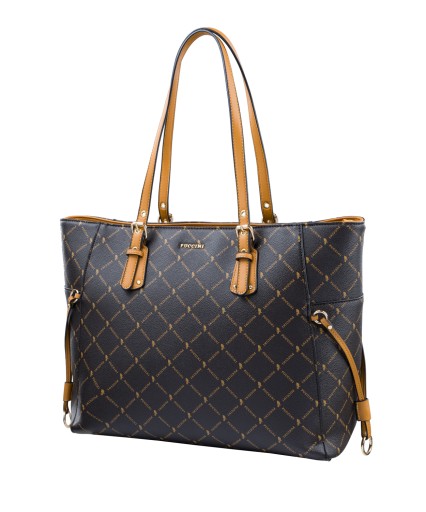 Elegancka i estetycznie zaprojektowana klasyczna shopperka, stanowiąca idealne dopełnienie niebanalnych stylizacji. Dedykowana kobietom ceniących sobie wygodne przemieszczanie się w przestrzeni miejskiej. Całość uszyta jest z lekko groszkowanej skóry ekologicznej, a cechą wyróżniającą torebkę jest oryginalny monogram marki Puccini. Fason został wyposażony w optymalnej długości uchwyty, dzięki czemu można go nosić na ramieniu lub przedramieniu. Przód torebki zdobi dyskretne logo Puccini oraz ozdobny brelok wykonany ze skóry ekologicznej, który został doczepiony do uchwytu. Środek obszyty jest bardzo przyjemnym materiałem sygnowanym logiem marki. Dodatkowo wewnątrz znajdziemy dwie otwarte kieszonki np. na telefon oraz jedna zamykana na suwak. Z tyłu torebki umieszczono jeszcze jedną, zamykaną zamkiem błyskawicznym. Usztywniony spód chronią stopki w złotym kolorze.