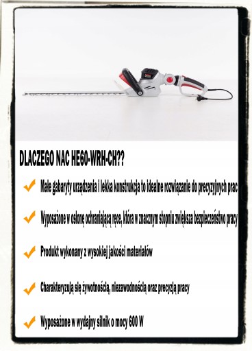- Elektryczne nożyce do żywopłotu HE60-WRH-CH zostały wyposażone w wydajny silnik o mocy 600 W