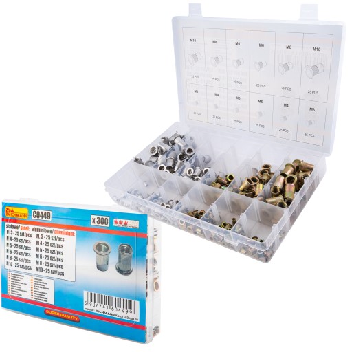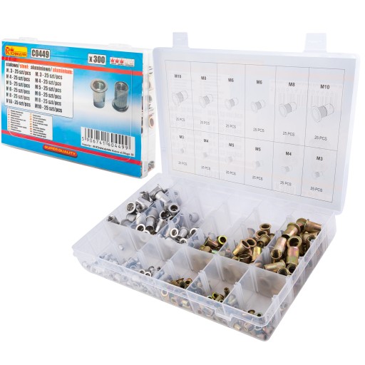 - Mieszany komplet 300 sztuk nitonakrętek stalowych i aluminiowych w różnych rozmiarach M3-M10.