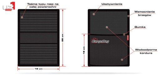 Wykonany z mocnej wodoodpornej cordury, pod spodu podszyty na całej powierzchni taśmą typu rzep.