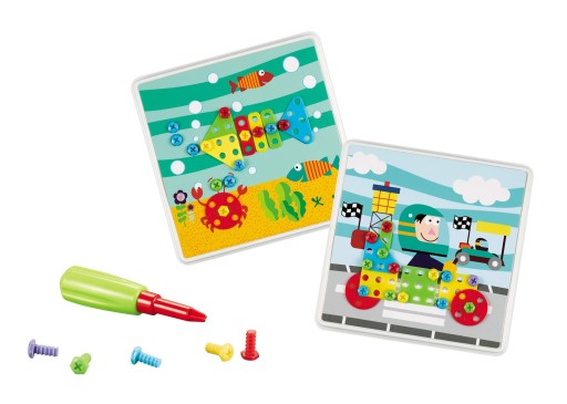 Przykręcanie kolorowych śrubek wymaga precyzji ruchów ręki - zabawka usprawni motorykę małą, pozowoli opanować chwyt pisarski oraz rozwinie umięjętności grafomotoryczne. Mozaika jest propozycją dla dzieci w wieku przedszkolnym, dzięki której proces nauki pisania będzie łatwiejszy. Pisanie jest procesem wymagającym prawidłowej koordynacji wzrokowo-ruchowej oraz precyzji ruchów - to wszystko umożliwia śrubowy trening małej rączki. Funkcje te dzieci mogą rozwijać dzięki odpowiednim ćwiczeniom grafomotorycznym. Zestaw zawiera: plastikowa podkładka woreczek do przechowywania śrubek i kształtów 8 plansz 116 elementów - śrubek, podkładek w kształcie trójkątów, kółek, kwadratów i prostokątów książeczka z dodatkowymi pomysłami