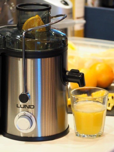 Wysokoobrotowa sokowirówka marki LUND z wydajnym silnikiem o mocy 600W oraz 2-poziomową regulacją prędkości do 13000 obrotów/minutę.