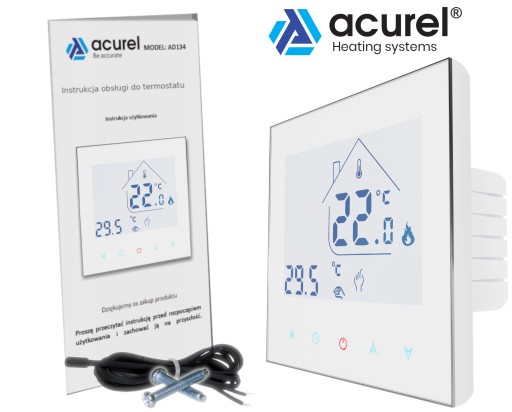 Acurel AC605H (AD134) to cyfrowy termostat, zaprojektowany w nowoczesnej stylistyce przy użyciu najlepszych materiałów. Termostat posiada wyświetlacz LCD z kontrastowym podświetleniem, co gwarantuje łatwy odczyt nawet w ciemnościach, a dotykowe przyciski umożliwiają prostą obsługę.