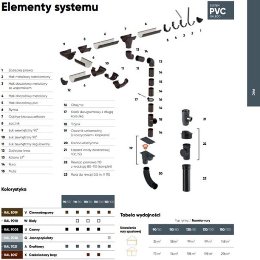 Dopasowany do systemu GALECO PVC 2, kolor osadnika jest zbliżony do koloru RAL 7021 GRAFITOWY ( Y ) w. g. kolorystyki producenta.