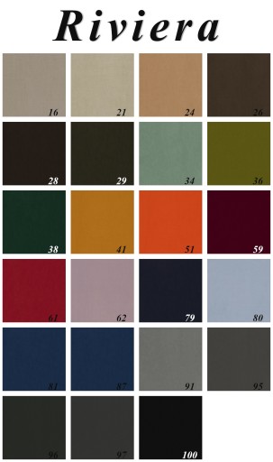 Tkanina Riviera jest bardzo mięciutkim w welurem. W dotyku przypomina aksamit, delikatnie mieniąc się po przejechaniu dłonią, dając niezwykle efektywną kombinację w połączeniu z bogatą gamą kolorystyczną, cechującą się intensywnymi, głębokimi kolorami.