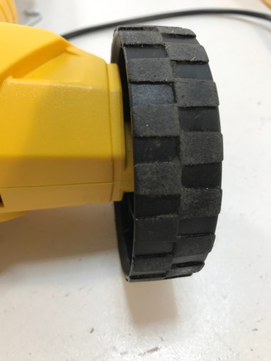 Skrobak nosi niewielkie ślady użytkowania: przetarcia na kółku, osłonie tarczy oraz nieznaczne zużycie szczotki drucianej.