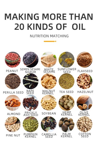 Możesz użyć tej maszyny do wyciskania prawie wszystkich rodzajów nasion, takich jak migdały, orzeszki ziemne, nasiona kamelii, rzepak, nasiona rącznika, sezam (czarny i biały sezam), soja, nasiona słonecznika, orzechy włoskie i makadamia. Olej sojowy, sezamowy, słonecznikowy itp. Różne urządzenia, sterowanie mikroelektryczne, ogrzewanie na podczerwień, filtr próżniowy, ponownie odsysane.