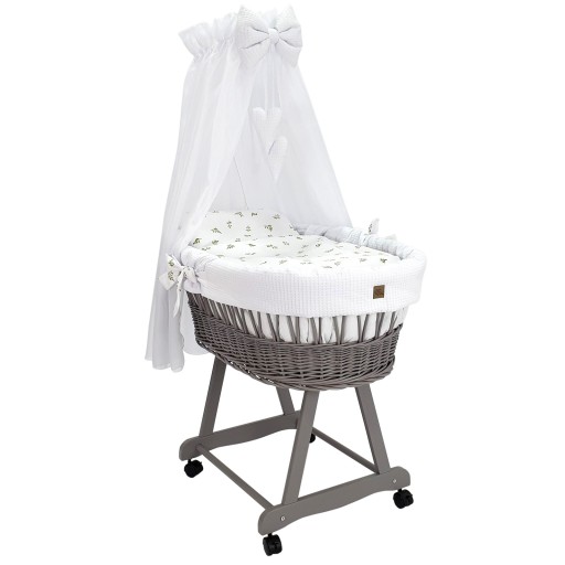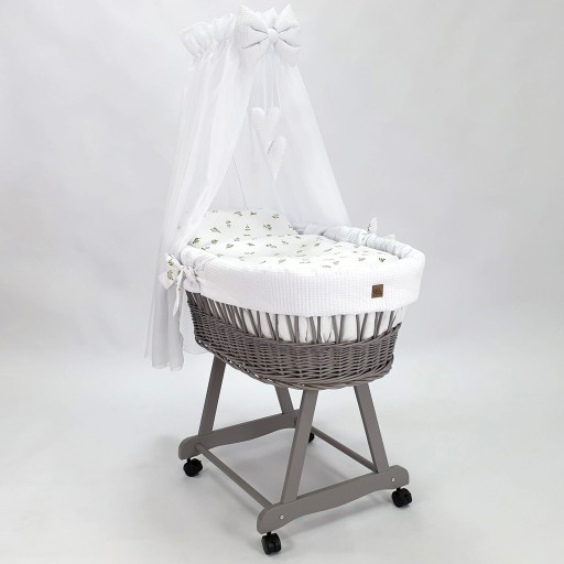 KOSZ MOJŻESZA — dedykowany niemowlakom do szóstego miesiąca życia. Ze względu na nieduże gabaryty i owalny kształt, otula maleństwo z każdej strony, dając mu poczucie bezpieczeństwa. Piękny, ręcznie pleciony, produkowany w Polsce produkt. W komplecie ze starannie wykonanym obszyciem, pościelą i materacykiem. Drewniane podwozie na kółeczkach pozwala na łatwe przemieszczanie go.
