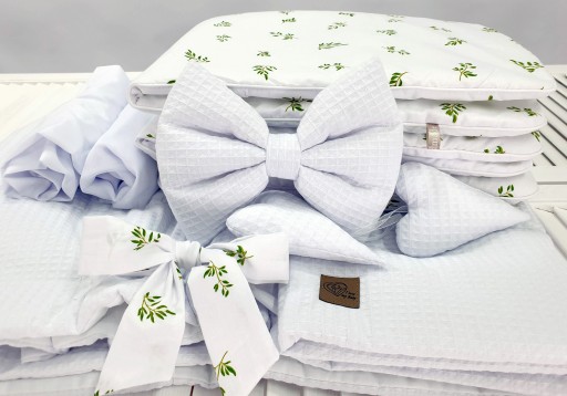Kołdra i poduszka w kolorze białym ze wzorem w zielone liście.